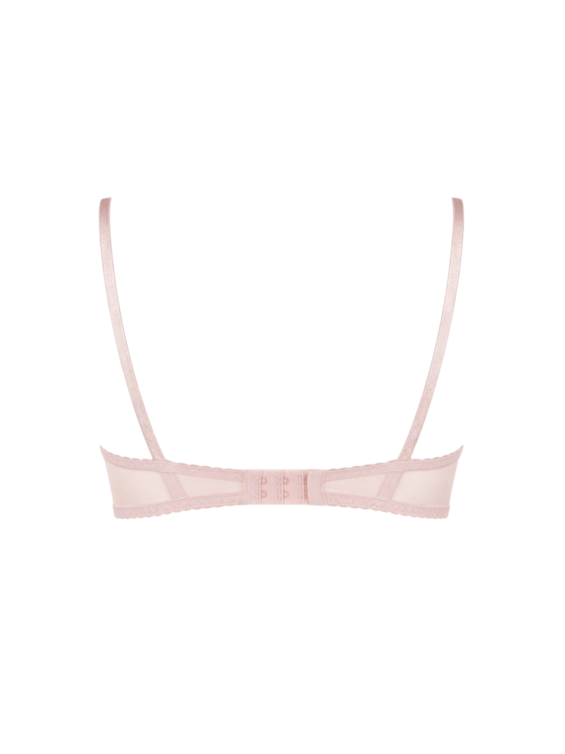 Koronka została wykończona subtelną falbanką pod biustem oraz na miseczkach, co nadaje całości romantycznego charakteru i lekkości. Pudrowy odcień różu sprawia, że biustonosz wygląda elegancko i naturalnie na skórze, idealnie komponując się zarówno z jasnymi stylizacjami, jak i jako element codziennej bielizny.