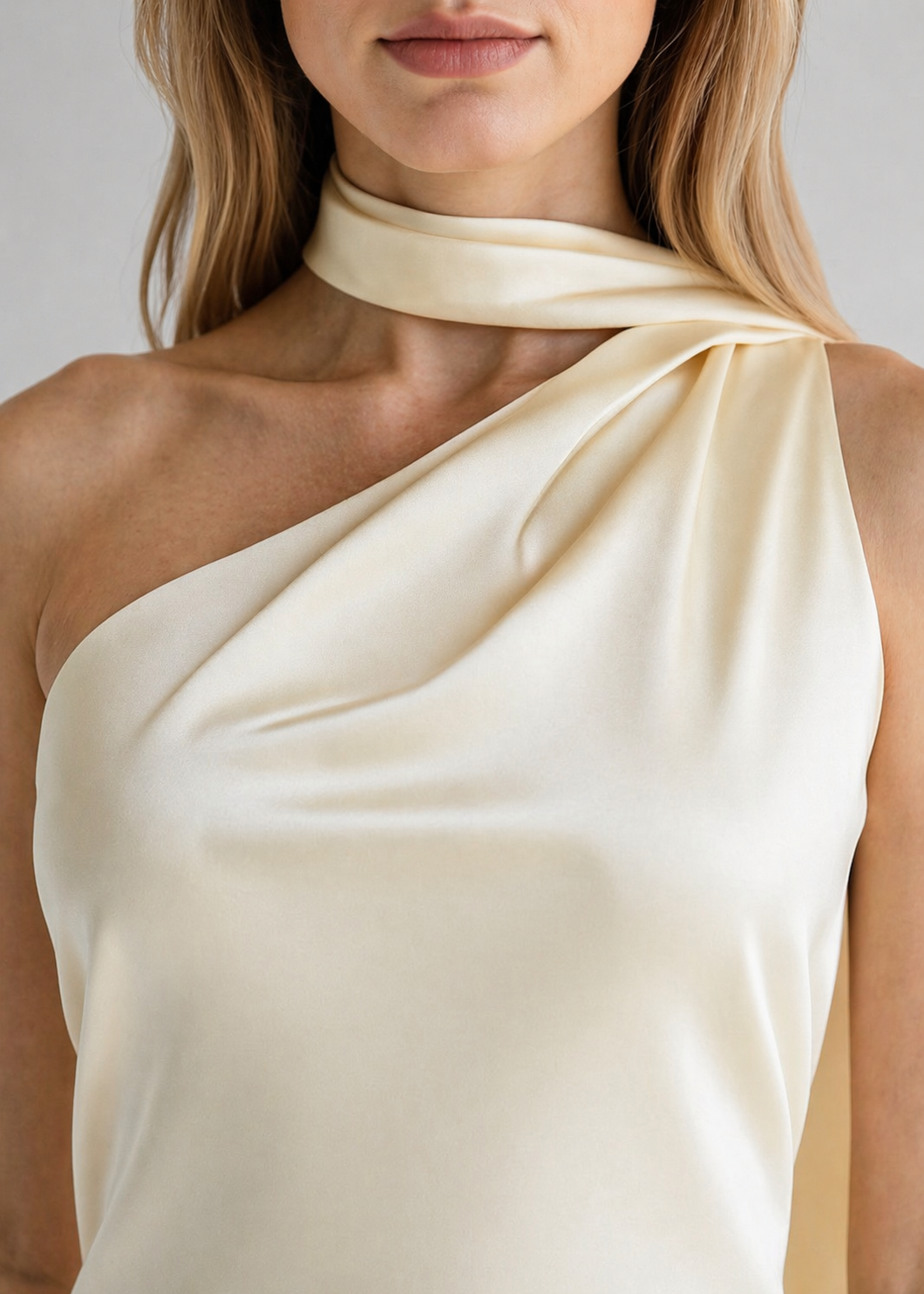 - Rodzaj dekoltu: zabudowany asymetryczny z długą szarfą